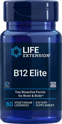 B12 Elite: 500mcg methylcobalamin + 500mcg adenosylcobalamin per lozenge. Supports brain health, dopamine, energy, B12 serum levels. For vegetarians/plant-based or age-related insufficiency. Lozenges, no sugar, vegan. Dosage: 1 lozenge daily.