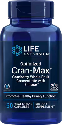 Product Name: Optimized Cran-Max 60 vegetarian capsules — Ingredients/Facts: Cran-Max whole cranberry concentrate, Ellirose hibiscus extract — Dosage/Use: Take as directed (usually 1-2 capsules per day)