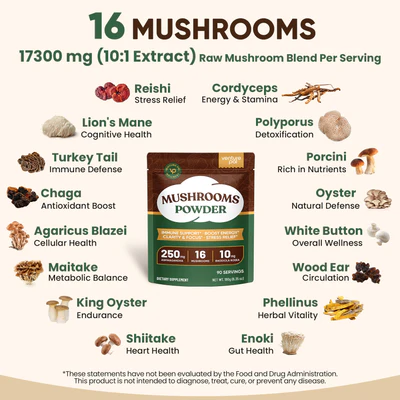 - Lion’s Mane: Supports brain health, focus, and memory.
