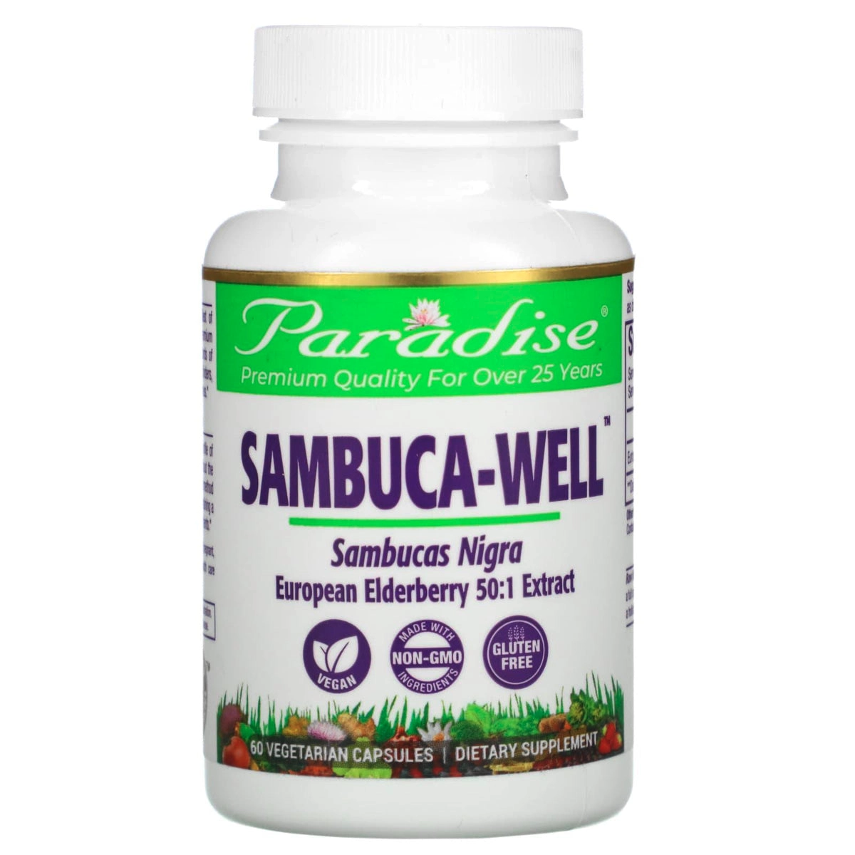 Sambuca Well: Sambucus (elderberry) focused immune support formula with complementary herbs. Usually 1 capsule daily or as directed. 60 vegetarian capsules. Free from major allergens, vegan. Details on all actives best confirmed via label.